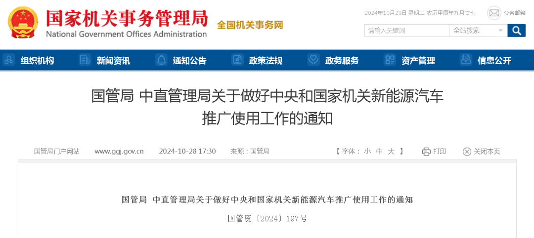 为深入贯彻落实党的二十大和二十届二中、三中全会精神,支持新能源汽车产业发展,更好发挥中央和国家机关示范引领作用,按照《党政机关公务用车管理办法》(中办发〔2017〕71号)、《新能源汽车产业发展规划(2021-2035年)》(国办发〔2020〕39号)、《关于促进汽车消费的若干措施》(发改就业〔2023〕1017号)、《“十四五”公共机构节约能源资源工作规划》(国管节能〔2021〕195号)等有关规定,现就做好中央和国家机关新能源汽车推广使用工作通知如下: 中央和国家机关各部门、各单位机关及其所属垂直管理机构、派出机构等各级行政单位和各类事业单位(以下简称各部门、各单位)配备更新各类定向化保障公务用车,应当带头使用国产新能源汽车。其中,机要通信用车、相对固定路线执法执勤用车以及使用场景单一、主要在城区行驶的业务用车等,原则上应当配备新能源汽车;用于环卫清洁、技术勘察、检验检测等用途的特种专业技术用车,新能源汽车能够满足需要的,应当优先配备新能源汽车。按照《关于促进汽车消费的若干措施》有关要求,加快国三及以下排放标准老旧车辆淘汰报废,更新车辆优先使用新能源汽车。 各部门、各单位应当根据车辆使用现状、工作需要等因素,编制公务用车年度配备更新计划,计划中明确新能源汽车采购数量,由行政主管部门审核批复后按归口报国管局、中直管理局备案。行政主管部门应当加强对所属单位采购新能源汽车的统筹管理,除因地理环境、气候条件特殊和无适配车型等情况外,新能源汽车占当年配备更新公务用车的比例应当达到《“十四五”公共机构节约能源资源工作规划》明确的“新增及更新车辆中新能源汽车比例原则上不低于30%”目标要求,以后按规定逐步提高。 各部门、各单位配备更新新能源汽车应当符合公务用车管理有关规定,不得超编制、超标准配备车辆。其中,配备新能源轿车的,价格不超过18万元;配备轿车以外的其他车型的,价格不超过《党政机关公务用车管理办法》规定的同类型燃油汽车的配备标准。确因工作需要,经批准通过社会化租赁方式保障公务出行的,应当优先租用符合规定标准的新能源汽车。 各部门、各单位应当在办公区统筹推进新能源汽车充电基础设施建设,有序规划类型和数量,鼓励集中办公区等公共区域建设具有一定规模的集中式充电基础设施。完善充电基础设施运行维护管理制度,规范新能源汽车充电基础设施管理,严格落实供电、集中充电场所安全要求。鼓励具备条件的单位内部充电基础设施向社会开放共享,提高充电基础设施使用效率。 各部门、各单位应当加强组织领导,明确工作责任,结合本部门、本系统实际细化落实举措,坚持因地制宜,积极稳妥做好新能源汽车推广使用工作。国管局、中直管理局将新能源汽车推广使用情况纳入中央和国家机关节约能源资源评价、国有资产管理绩效评价的重要内容,采取适当方式对典型经验做法进行宣传推广,充分发挥中央和国家机关示范引领作用,为全社会推广使用新能源汽车营造良好氛围。 对于政策执行过程中遇到的问题,请及时向国管局、中直管理局反馈。