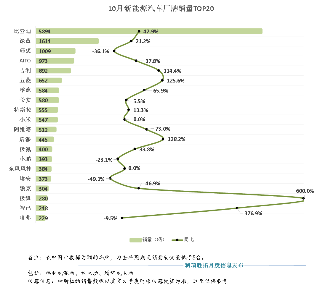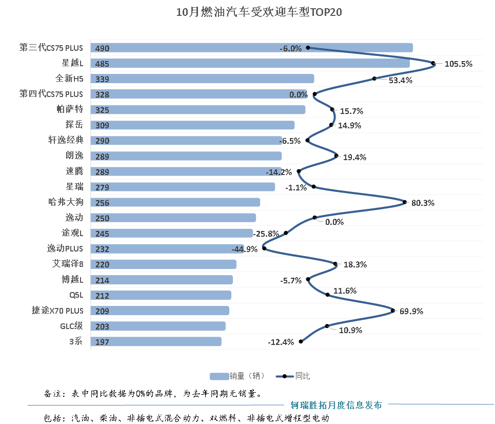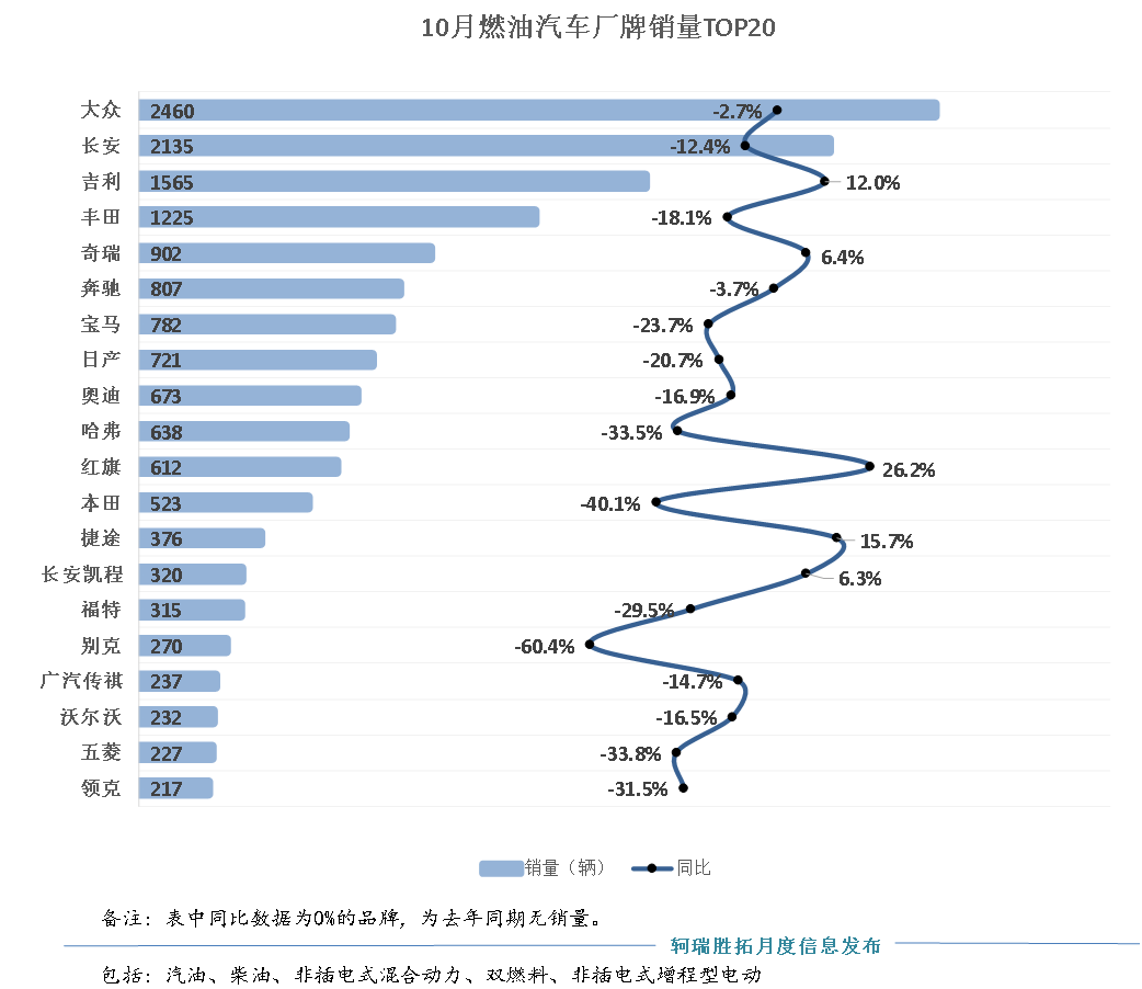 从10月份燃油车品牌的销量排名来看,燃油车市场依然严峻,大部分品牌销量同比下滑,只有吉利、奇瑞、红旗、捷途、长安凯程等五个品牌销量同比正增长。