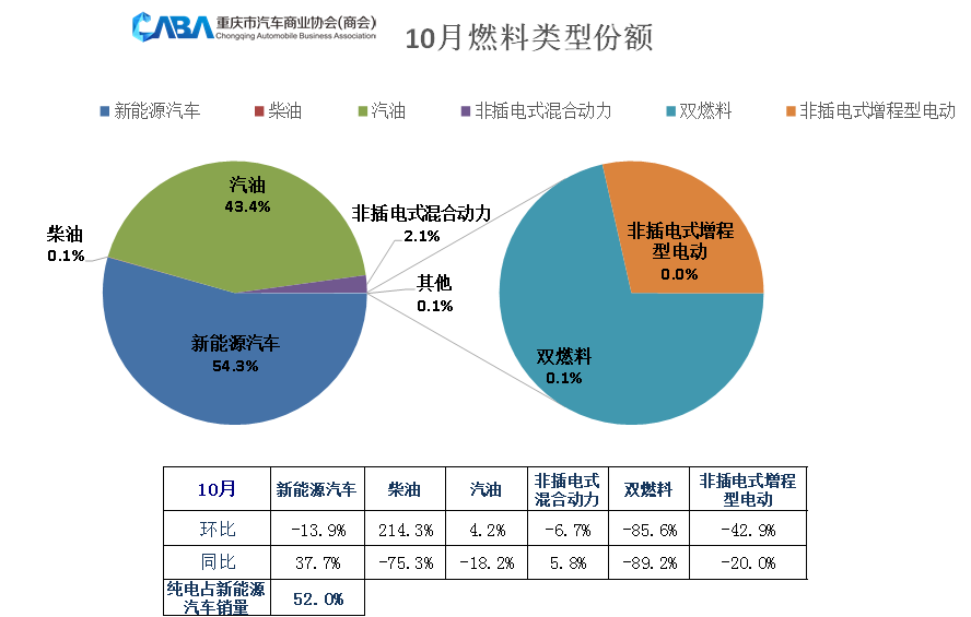 从10月销售车型的燃料类型来看,重庆市场燃油车销量占比为43.4%,新能源汽车销量占比达到54.3%;10月份,新能源汽车销量同比增长37.7%,其中,纯电车型占比达52.0%。